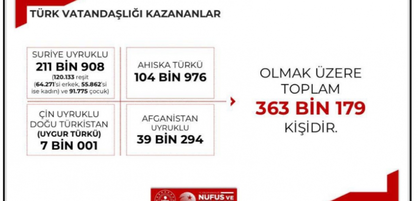 Aktarılan bilgilere göre, toplam 363 bin 179 kişi Türk vatandaşlığına hak kazandı.