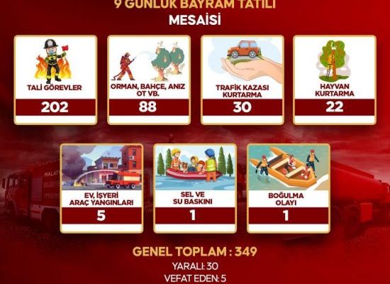 Malatya Büyükşehir Belediyesi İtfaiye Dairesi Başkanlığı tarafından 9 günlük bayram tatili süresince yüzlerce vakaya müdahale edildi. 9-17 Temmuz tarihleri arasında başta yangınlar olmak üzere, trafik kazaları, ev, işyeri ve araç yangınları, boğulma, sel ve su baskını, hayvan kurtarma ve diğer tali görevlere anında müdahale edildi.