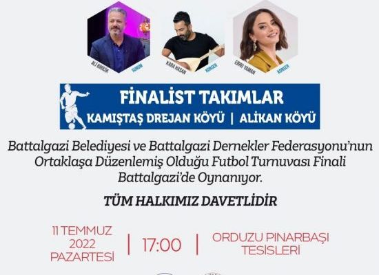 Battalgazi Belediyesi ve Battalgazi Dernekler Federasyonu tarafından “Bekir Alyüz Futbol Turnuvası”nın finali ve mini bir konser programı düzenlenecek. 11 Temmuz Pazartesi günü saat: 17.00’de Orduzu Pınarbaşı Tesisleri’nde Kamıştaş Drejan Köyü ile Alikan Köyü takımlarının oynanacağı futbol turnuvası final müsabakasının ardından, Orduzu Pınarbaşı Yeni Malatyaspor tesislerinde yapılacak olan ve sunuculuğunu Ali Biricik’in üstleneceği konser programında yerel sanatçı Ebru Yaman ve Kara Hasan sahne alacak. En güzel şarkılarını Malatyalılar için seslendirecek olan sanatçılar, programa katılacak vatandaşlara unutulmaz bir gece yaşatacak. Oynanacak olan final müsabakası ve ücretsiz konser programı ile Malatyalı vatandaşlar, Kurban Bayramını dolu dolu geçirecek.