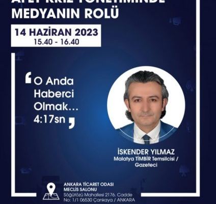 Türk İnternet Medya Birliği (TİMBİR) ile Radyo ve Televizyon Üst Kurulu (RTÜK) tarafından 14 Haziran Çarşamba günü Ankara Ticaret Odası Meclis Salonu’nda “Medya Fark Ederse Toplum da Fark Eder” temasıyla “Afet Kriz Yönetiminde Medyanın Rolü” paneli düzenlenecek. 81 ilden ve 14 ülkeden temsilcilerin katılacağı panele TİMBİR Malatya Temsilcisi ve Malatya Mega haber Genel Yayın Yönetmeni İskender Yılmaz da katılacak. Yılmaz panelde “O Anda Gazeteci Olmak” konusunda bir oturumda konuşmacı olacak.