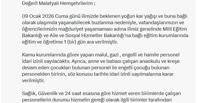 09 Ocak 2026 Cuma günü ilimizde beklenen yoğun kar yağışı ve buna bağlı olarak ulaşımda yaşanabilecek buzlanma nedeniyle, vatandaşlarımızın ve öğrencilerimizin mağduriyet yaşamaması adına ilimiz genelinde Milli Eğitim Bakanlığı ve Aile ve Sosyal Hizmetler Bakanlığı’na bağlı eğitim kurumlarında eğitim ve öğretime 1 (bir) gün ara verilmiştir.