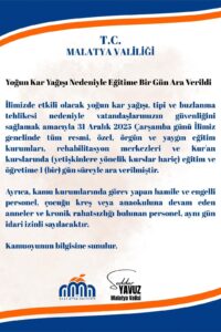31 Aralık Günü İlimizde yoğun kar yağışı ve kuvvetli don beklendiğinden Eğitim ve Öğretime 1 gün süre ile ara verilmesine karar verilmiştir.