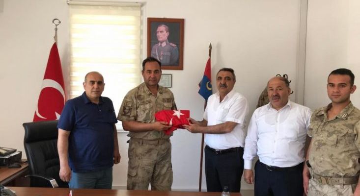 Başkan v. Basri Yılmaz, İlçe Jandarma Komutanı v. Jandarma Astsubay Kıdemli Başçavuş Şerafettin Demircioğlu’na Türk bayrağı ve Kur’an-ı Kerim hediye etti.